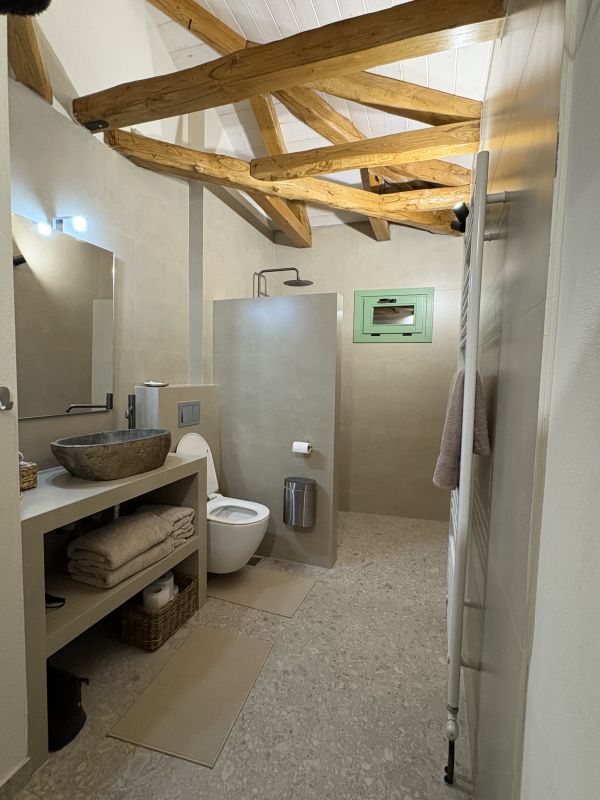 Aansluitend aan de slaapkamer een sfeervolle open badkamer met stenen wastafel, inloopdouche en toilet.