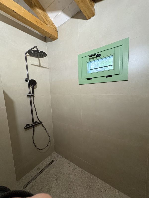 Δίπλα στο υπνοδωμάτιο υπάρχει ένα γοητευτικό ανοιχτό μπάνιο με πέτρινο νιπτήρα, καμπίνα ντους και τουαλέτα.