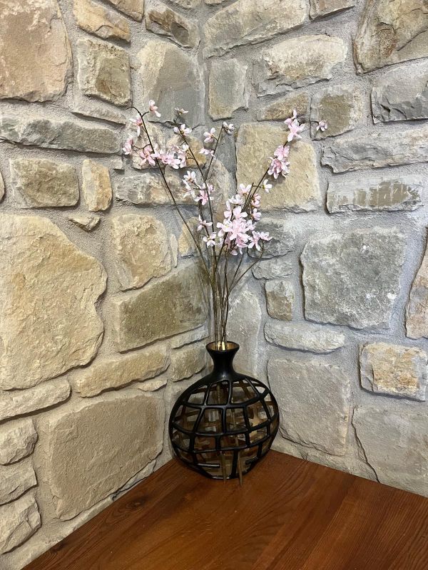 Ο πίσω τοίχος είναι ατμοσφαιρικά φτιαγμένος από πέτρα και εκτείνεται στο υπνοδωμάτιο.