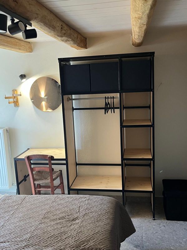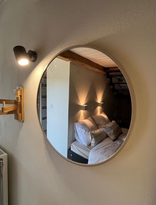 Via de trap naar beneden in de woonkamer kom je in de warm aangeklede slaapkamer met als speciaal decor de oude voordeuren aangebracht in de stenen muur.