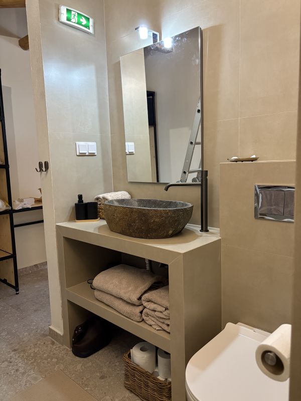 Δίπλα, πίσω από τον τοίχο στο υπνοδωμάτιο, βρίσκεται ένα μοντέρνο μπάνιο με νιπτήρα, καμπίνα ντους και τουαλέτα. Πρόσβαση μέσω "μπαλκονόπορτας" σε ένα μικρό εξωτερικό καθιστικό με έναν μικρό καναπέ.