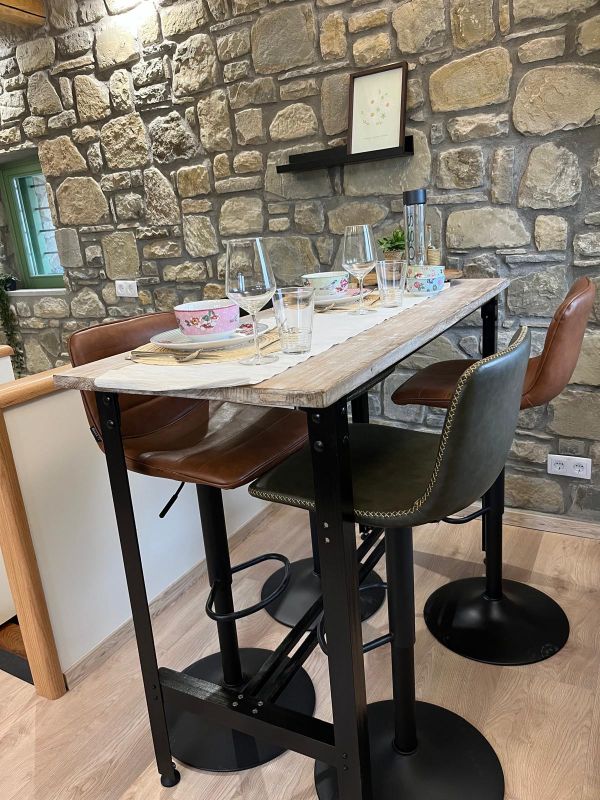 Άνω όροφος: Από την είσοδο, μπαίνετε στο σαλόνι με έναν καναπέ-κρεβάτι 140 εκ. (2 ατόμων), τραπεζάκι του καφέ, πλήρως εξοπλισμένη μικρή κουζίνα με μίνι ψυγείο και εστίες 2 εστιών, και μια ψηλή τραπεζαρία με 4 σκαμπό για φαγητό ή παιχνίδι.