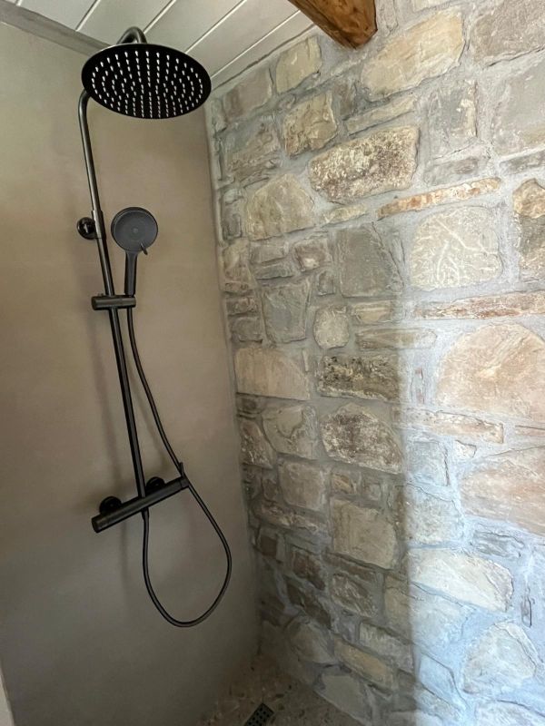 Aansluitend, achter de muur in de slaapkamer een moderne badkamer met wastafel, inloopdouche en toilet. Toegang tot via "balkondeur" naar klein zitje buiten met bitrosetje.